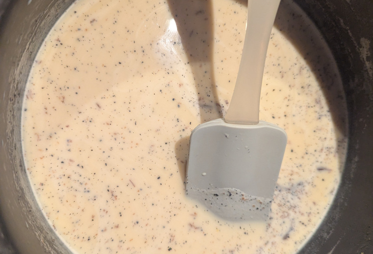 - Lorsque le lait est tiède, retirer la gousse et y verser progressivement le mélange œufs/sucre/farine en fouettant.