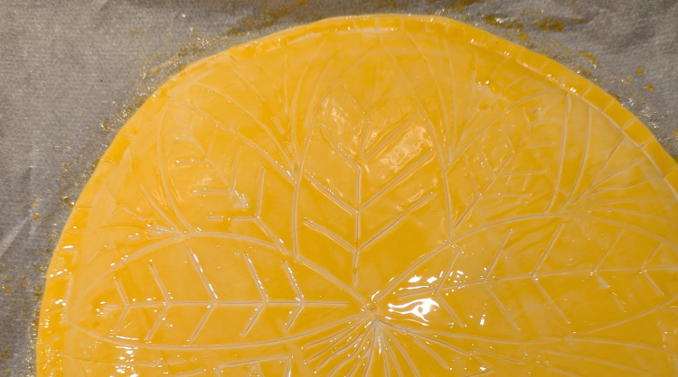Rendu d'une deuxième dorure - Dessiner des stries décoratives au couteau, sans percer la pâte.