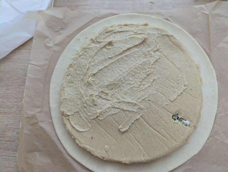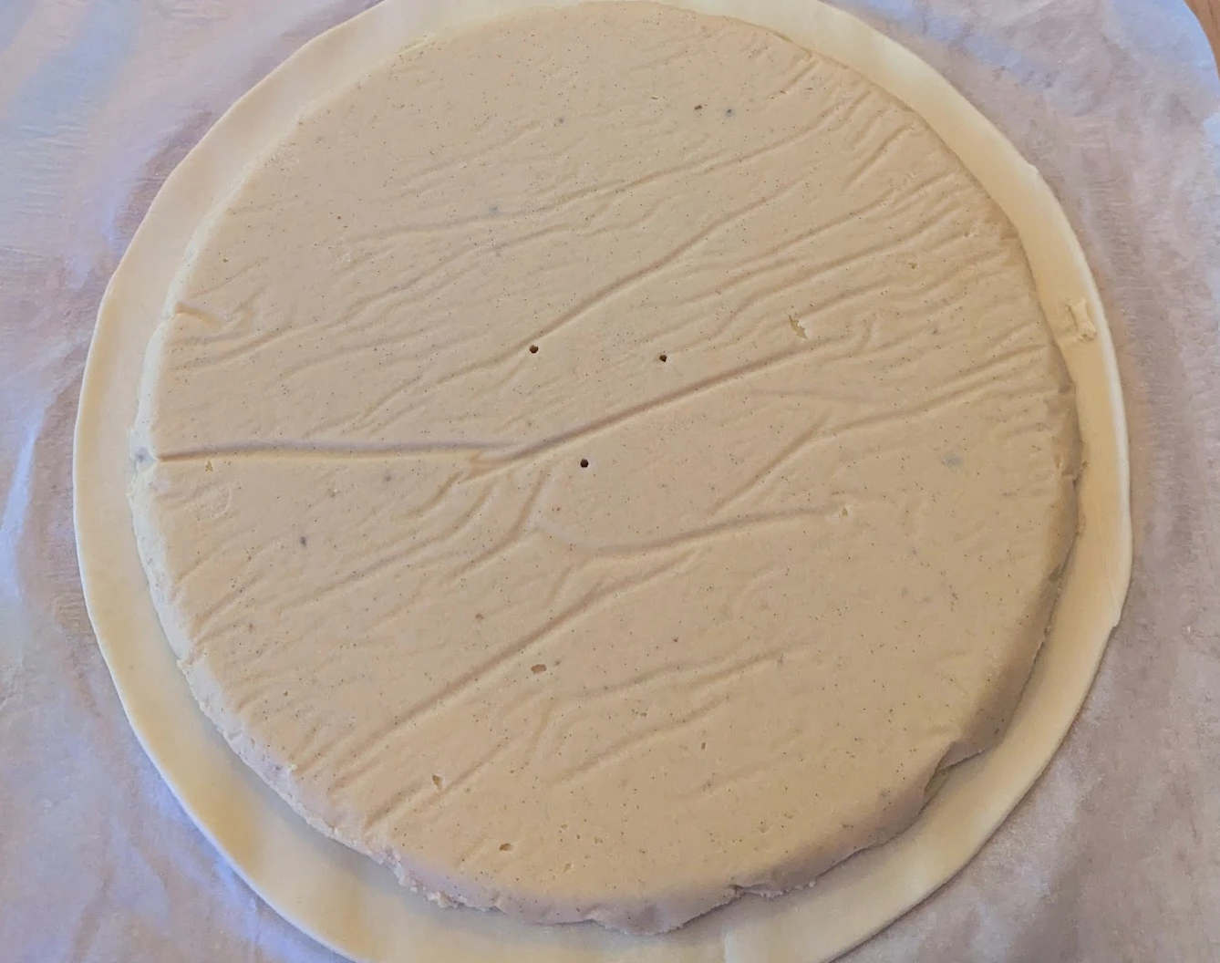 - Méthode du disque congelé : Déposer au centre le disque de frangipane encore congelé, sans en mettre sur les bords de la pâte.
